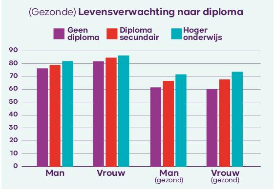 De levensverwachting in goede gezondheid in België bedraagt gemiddeld 63,7 jaar. Vijftien jaar geleden was dat… ook al 63,7 jaar5. Er worden meer mensen oud, maar niet per se “gezonder” oud. Ook hier schuilt een grote ongelijkheid. Wie een diploma hoger onderwijs op zak heeft, leeft 10 tot 13,5 jaar langer in goede gezondheid dan iemand zonder diploma. De ongelijkheid in gezonde levensverwachting stijgt.6
