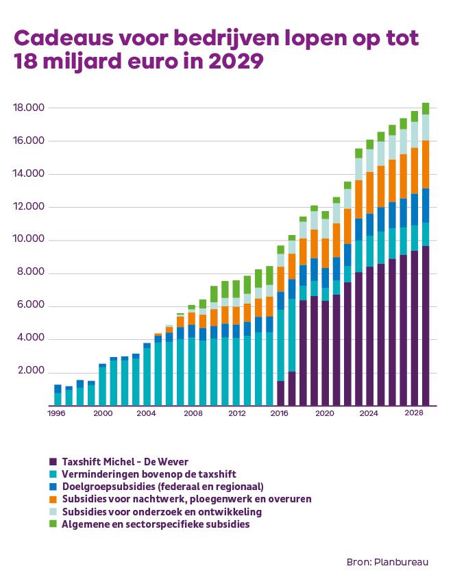 Er is wel een groeiend probleem bij de inkomsten. De regering-Michel voerde een taxshift in die een gat sloeg van 8 miljard in de sociale zekerheid. Samen met eerdere maatregelen lopen de vrijstellingen en verminderingen van sociale bijdragen op tot 16 miljard euro per jaar7. Dat evolueert volgens het Planbureau naar 18 miljard in 2029. En Arizona wil daar nóg een schep bovenop doen. Zo creëert zij zelf een probleem met de betaalbaarheid van onze pensioenen.