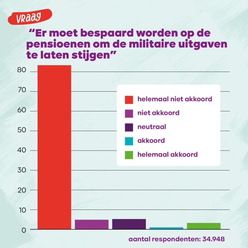 Bijna 9 op de 10 respondenten (89,67%) zijn het oneens met de stelling: “We moeten besparen op onze pensioenen om de militaire uitgaven te verhogen.” Ook bij mensen die stemden voor een regeringspartij gaat het om iets meer dan 8 op de 10.