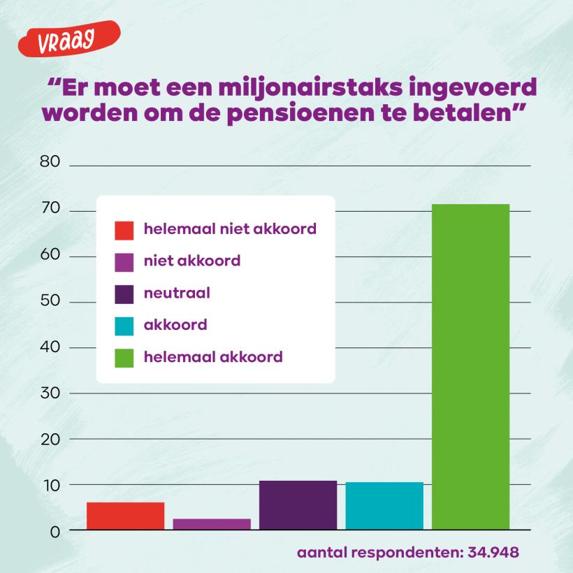 81,39% van de respondenten antwoordde positief op de vraag of er een miljonairstaks moet komen om ruimte te creëren om de pensioenen te financieren. Uit eerdere peilingen van de media bleek al dat vier op de vijf Belgen voorstander zijn van een vermogensbelasting.
