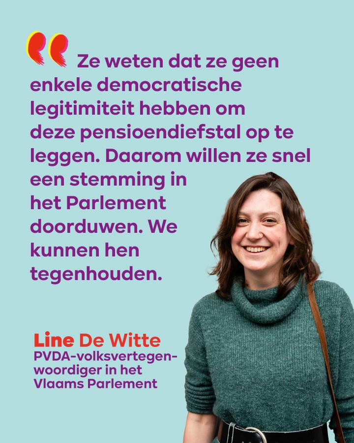 “Ze weten dat ze geen enkele democratische legitimiteit hebben om deze onrechtvaardige en vrouwonvriendelijke hervorming op te leggen”, zegt Line De Witte, PVDA-volksvertegenwoordiger in het Vlaams Parlement. “Daarom willen ze snel een stemming in het Parlement doorduwen. We kunnen hen tegenhouden.”