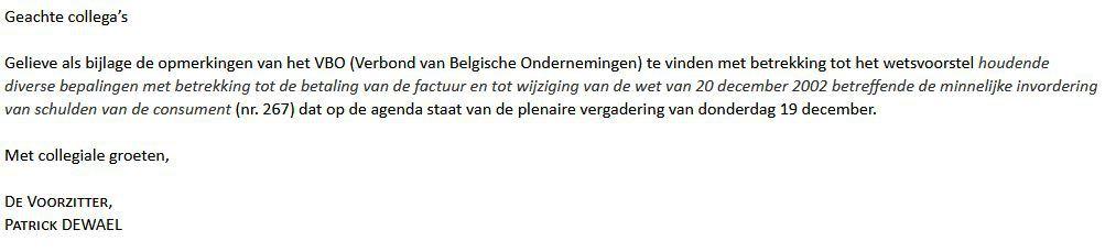 Dit is een hoogst ongebruikelijke procedure, die nog stuitender wordt wanneer je de brief van het VBO leest in de bijlage bij de mail van de voorzitter. De werkgeversfederatie vraagt niet alleen om de toekomstige tekst van het wetsvoorstel te wijzigen, maar voegt er ook al volledig opgestelde amendementen bij, zelfs met een motivering voor elk amendement, zoals het reglement van de Kamer eist.