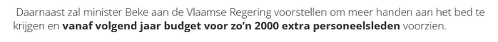 - In juli 2020 spreekt creatief boekhouder Beke enkel nog over de 2.000: “Daarnaast zal minister Beke aan de Vlaamse Regering voorstellen om meer handen aan het bed te krijgen en vanaf volgend jaar budget voor zo’n 2000 extra personeelsleden voorzien.”