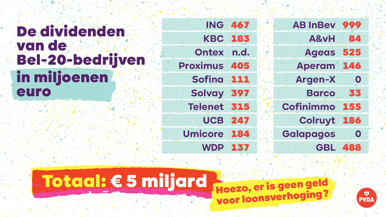 Zeventien van de Bel-20-bedrijven hebben al aangekondigd dat ze dit jaar dividenden zullen uitkeren. Het gaat in totaal om iets meer dan 5 miljard euro. De studiedienst van de PVDA berekende dat een loonsverhoging van 5% in diezelfde bedrijven 1,2 miljard euro zou kosten. Dat is slechts een kwart van het bedrag van de aangekondigde dividenden.