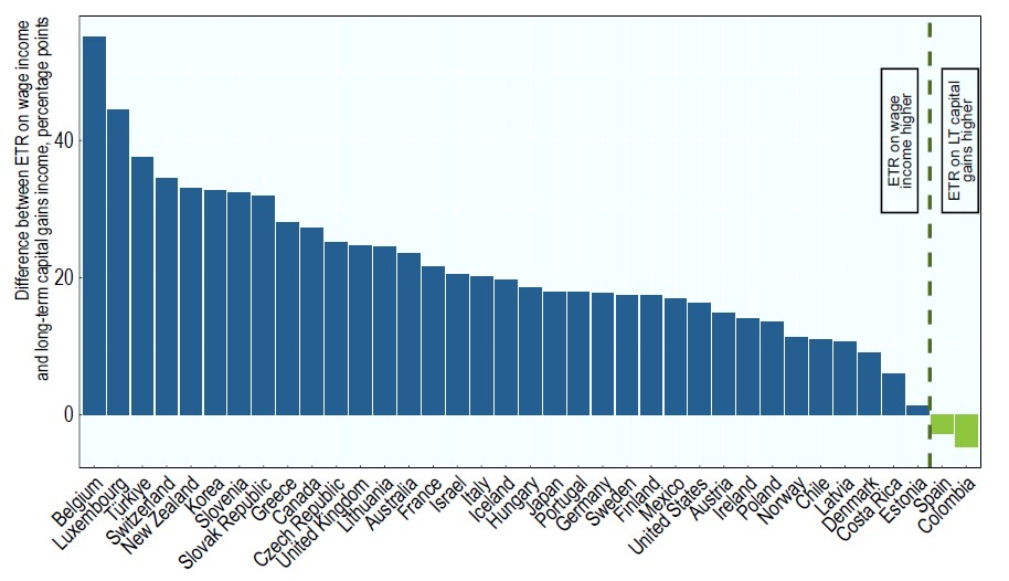 grafiek: Verschil in effectief belastingtarief tussen lonen en meerwaarden op kapitaal