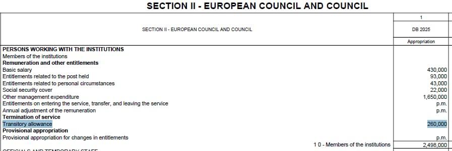 260.000 euro. Dat is het waanzinnige bedrag dat de begroting van de Europese Raad opzij zet voor de afscheidspremie van haar voorzitter, Charles Michel. Rudi Kennes ontdekte het cijfer van de gouden parachute toen hij de begroting van de Raad analyseerde. (zie afbeelding hieronder)