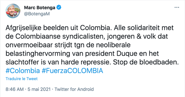 In de straten van Bogotá, Medellín, Pamplona en zeker in Calí woedt een echte oorlog. Sociale media worden overspoeld met alarmerende berichten en video’s over aanvallen van het leger en de ESMAD (oproerpolitie) op vreedzame manifestaties: 726 arbitraire aanhoudingen, 28 mensen vermoord, 234 gewonden, 5 verdwenen personen, 12 mensen met oogletsels en 6 vrouwen die verkracht werden, dat is het bilan na 5 dagen van onvermoeibare manifestaties. De regering is voor deze schendingen van de mensenrechten verantwoordelijk. Zij stuurde de politie, de ESMAD en het leger de straat op.