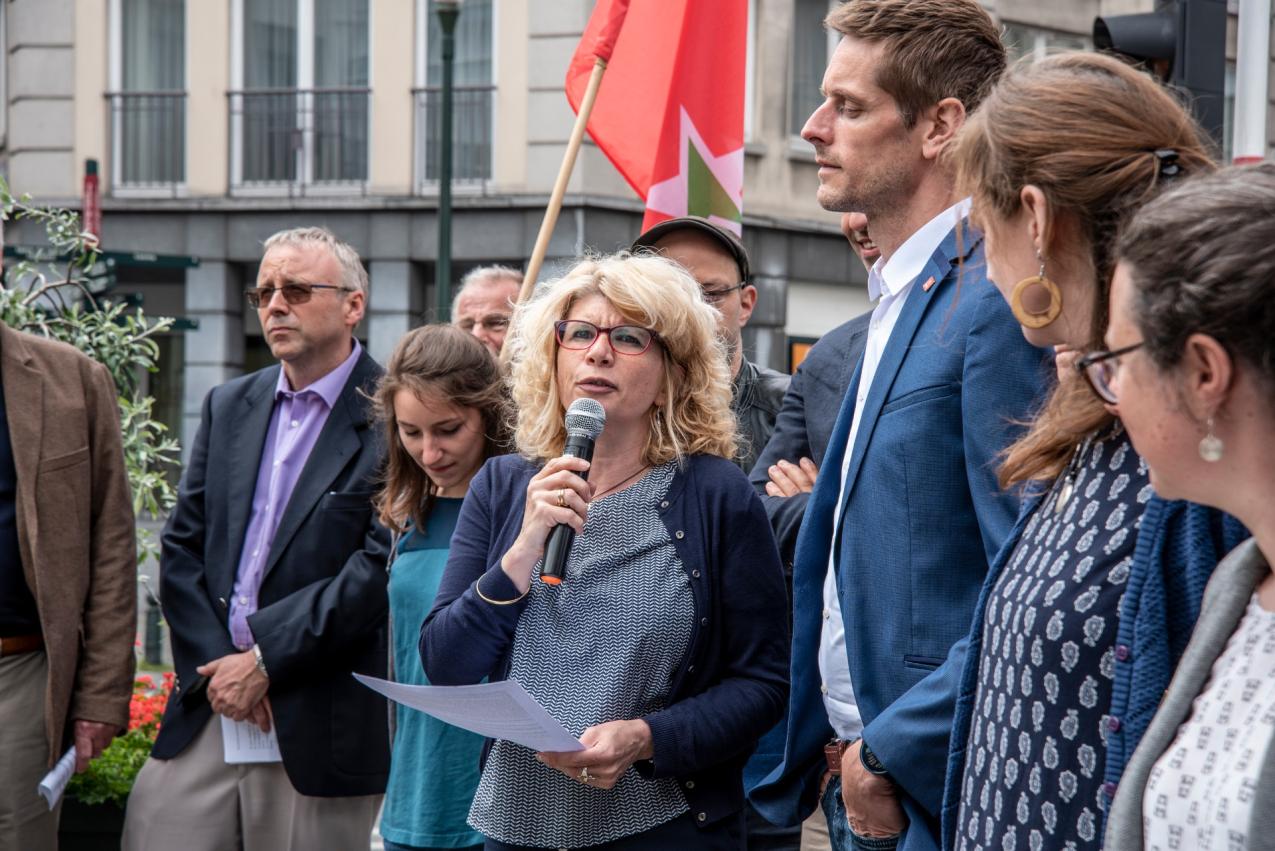 “In 2014 stuurde de PVDA voor het eerst verkozenen naar de parlementen”, zegt Françoise De Smedt, de nieuwe fractievoorzitter van de PVDA in het Brussels Parlement. “Vijf jaar geleden legden Michaël Verbauwhede, Mathilde El Bakri, Youssef Handichi en Claire Geraets op dezelfde plaats de eed af op straat. Zij baanden de weg voor de verkozenen van het volk, verkozenen die de link legden met het leven van de bevolking en hun strijd, en die dan terug naar de wijken gingen of de bedrijven om uit te leggen wat er zich in het parlement afspeelt. Zij baanden de weg voor verkozenen die beleid voeren met de mensen en niet in een gesloten onderonsje.”