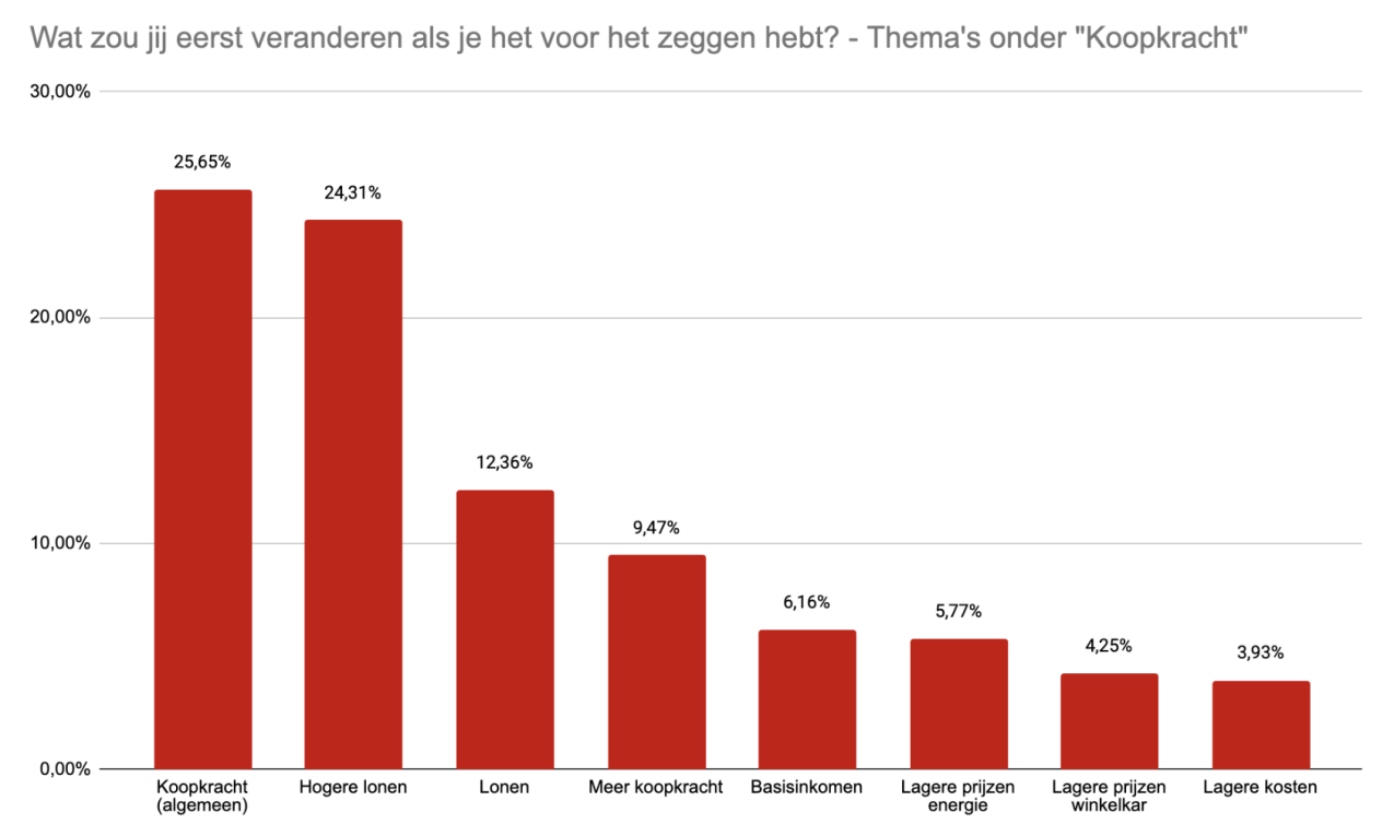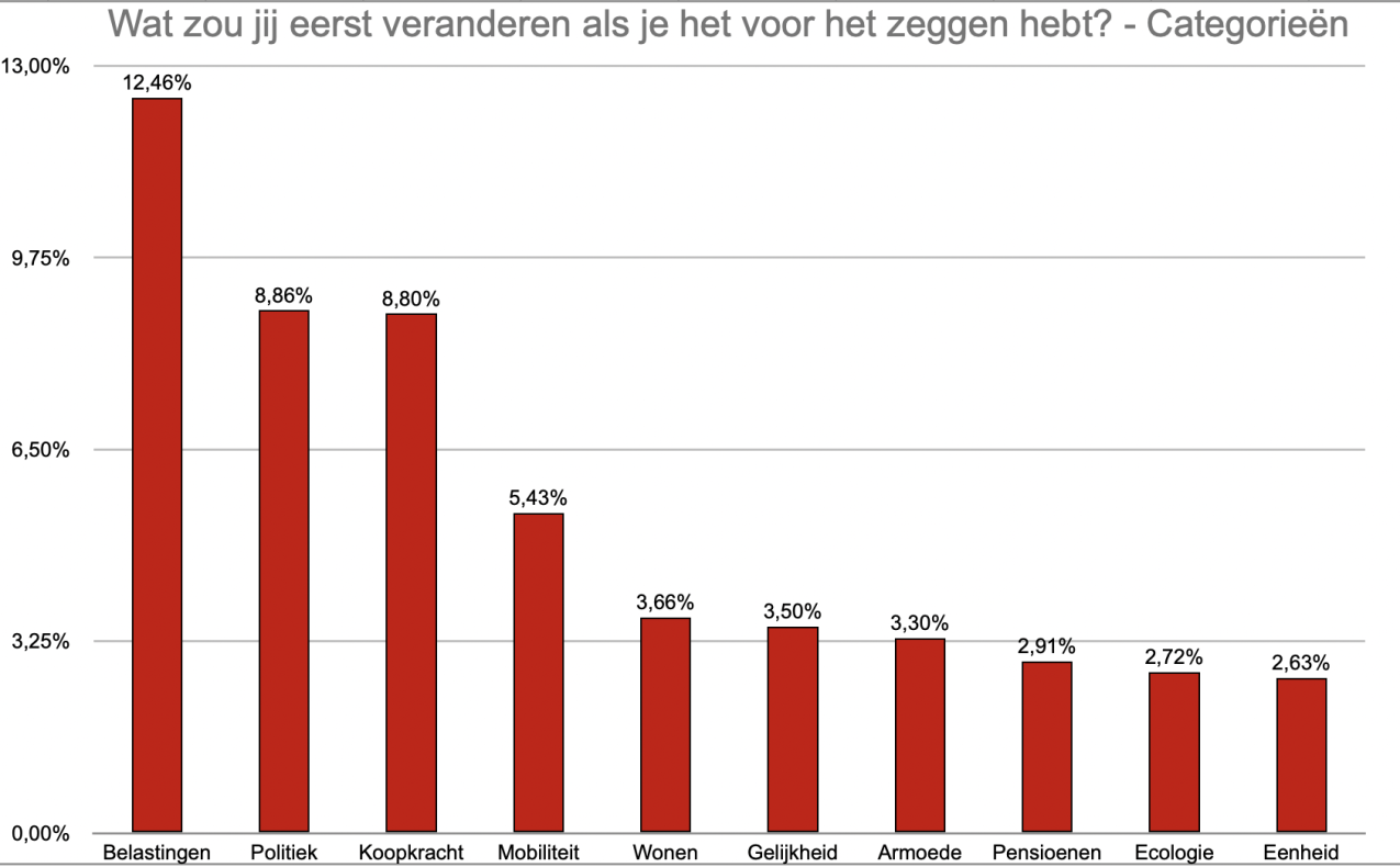 Hetzelfde zien we bij een analyse van de open vraag. We konden meer dan 87.000 antwoorden verdelen in bijna 500 thema’s, die we bundelden in 37 categorieën. De categorie “Belastingen” komt daarbij met grote voorsprong (12,5%) uit de bus als belangrijkste onderwerp, gevolgd door “Politiek” (8,9%) en “Koopkracht” (8,8%). Op geruime afstand volgen categorieën als mobiliteit, wonen, gelijkheid en armoede.