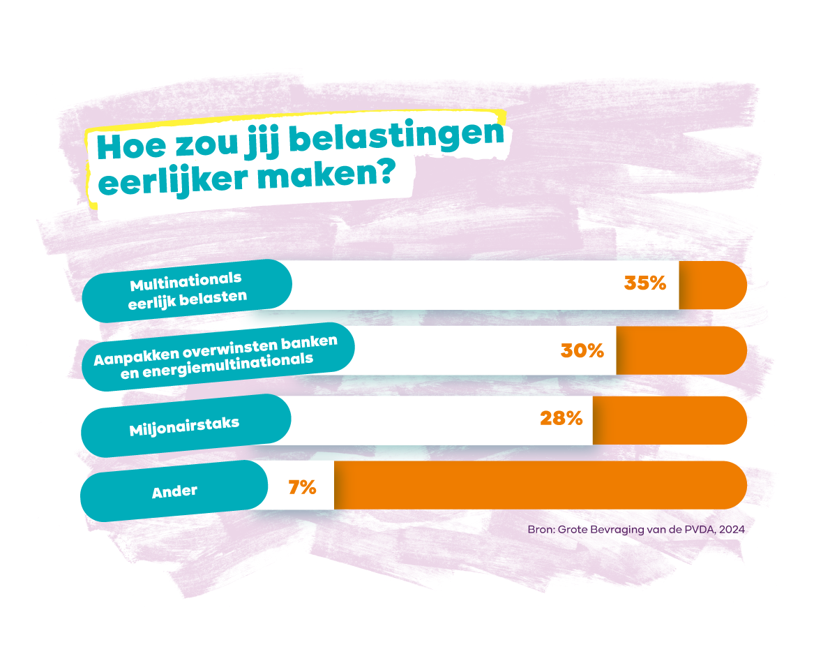 Ook uit de open vraag blijkt dat heel wat mensen aanvoelen dat ons belastingsysteem niet eerlijk is. Na algemene verwijzingen naar “belastingen” komt “eerlijke belastingen” als belangrijkste thema naar voor. Ook een eerlijke bijdrage van de rijken scoort opvallend hoog. En de roep naar een vermogensbelasting is het hoogste concrete voorstel. Terwijl de armoede in ons land blijft groeien, betalen multimiljonairs nauwelijks belasting op hun fortuin. Dat is onrechtvaardig.