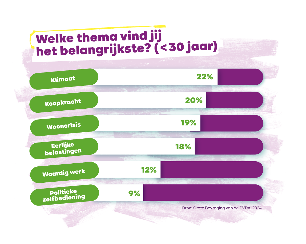 Bij jongeren onder de 30 jaar, springen er twee andere thema’s uit: klimaat en wonen. Bijna een op de vier jongeren noemt klimaat als allerbelangrijkste thema. Ze voelen aan dat zonder het systeem ter discussie te stellen, het probleem niet ernstig genoeg genomen wordt en de situatie alleen maar erger wordt, met bijvoorbeeld grote droogtes en ongeziene overstromingen tot gevolg.