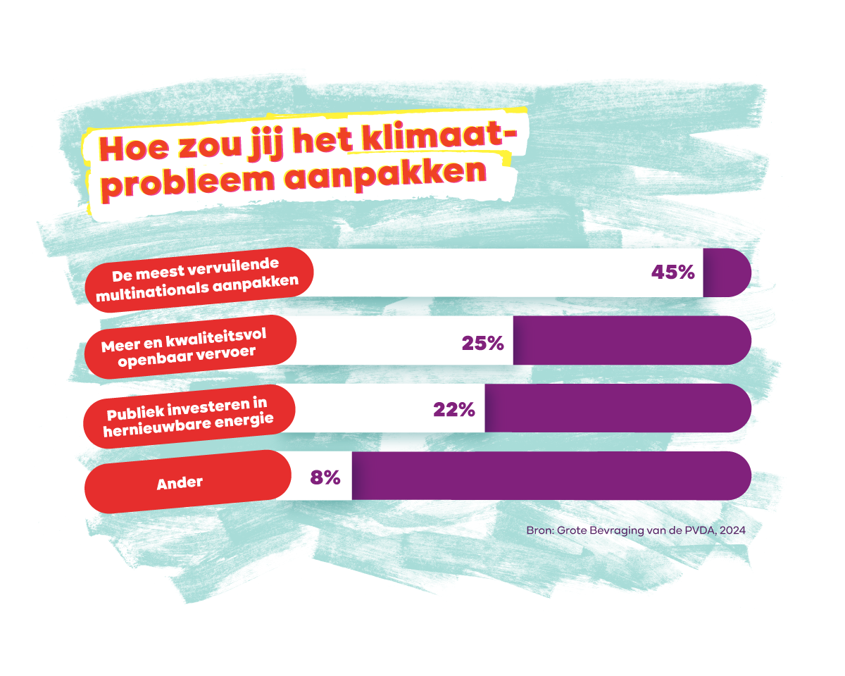 Er is veel steun om de grote vervuilers, de multinationals, strenger aan te pakken. Het gevoel leeft dat de werkmens weer de lasten op zich moet nemen, ook als het gaat om de klimaatproblematiek. Er is een roep naar constructieve, sociale maar ook eerlijke oplossingen. Wij kiezen voor een sociaal klimaatbeleid, niet voor nieuwe koolstoftaksen. Er is nood aan maatregelen die goed zijn voor het klimaat én voor de portemonnee.