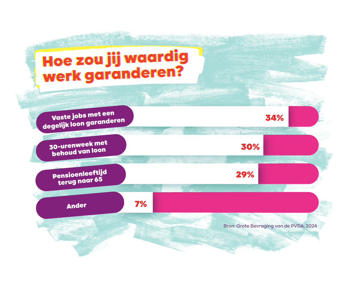 Rond waardig werk liggen alle eisen qua populariteit dicht bij elkaar. Men wil werk op mensenmaat. Werknemers worden zot gedraaid door altijd maar harder, langer en flexibeler te moeten werken. Het resultaat is meer langdurig zieken, steeds meer moeite om werk en gezin te combineren.