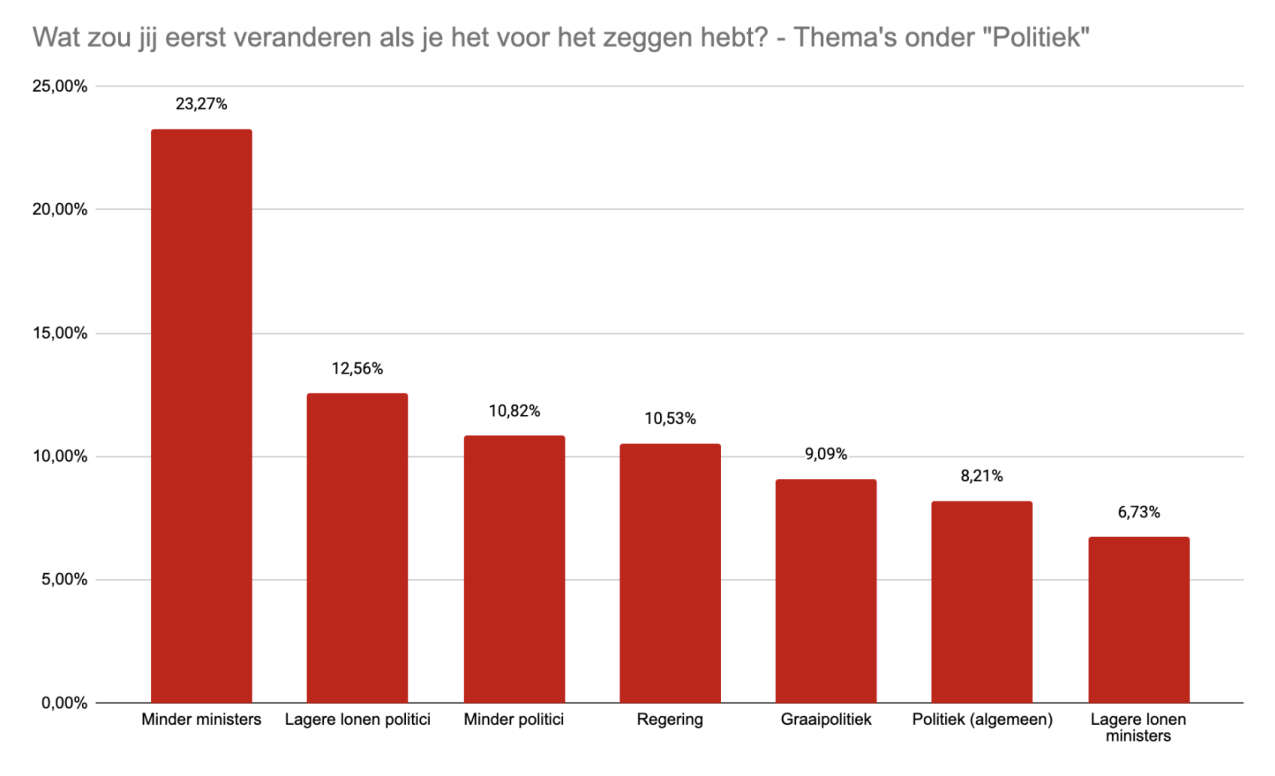 “Politiek” is maar liefst de tweede populairste categorie bij de open vraag. Opnieuw zien we een bevestiging dat “minder ministers” bijzonder populair is als eis. Er is een gevoel dat de vele regeringen getuigen van een zekere spilzucht. Dat eenheid als categorie het ook behoorlijk goed doet (zie boven), bevestigt dit. Ook de hoge lonen van politici worden vaak genoemd, de algemene roep naar minder politici of voor een andere regeringen, en de vraag naar een aanpak van de politieke zelfbediening.