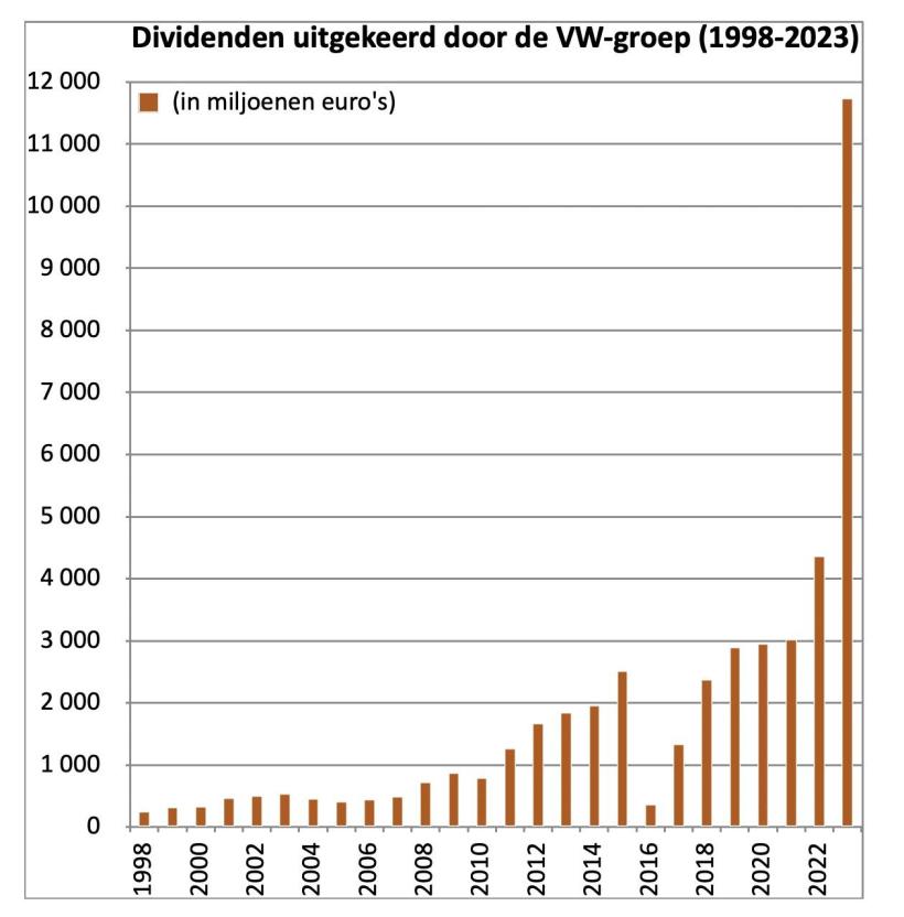 De Volkswagen-groep – Europa's grootste autofabrikant, waartoe ook het merk Audi behoort – heeft in 2023 bijna 12 miljard aan dividenden uitgekeerd aan zijn aandeelhouders. Een historisch jaar voor de aandeelhouders, die de afgelopen 25 jaar exponentieel rijker zijn geworden.