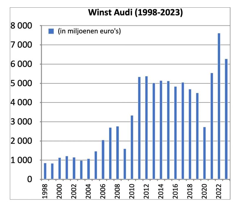 In de afgelopen twee jaar (2022 en 2023) heeft de Audi-groep de grootste winsten geboekt in de geschiedenis van zijn bestaan, dankzij het harde werk van het personeel. In 1998 bleef het bedrijfsresultaat onder het miljard euro steken, terwijl het 6,3 miljard euro bedroeg in 2023 en 7,6 miljard euro in 2022. Het dagblad L'Ćcho noemde Audi daarom "een melkkoe voor de Volkswagen-groep".
