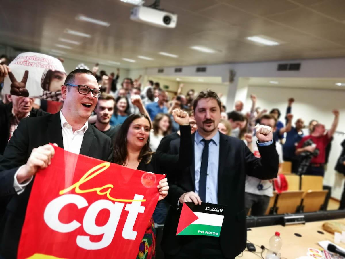 Raoul Hedebouw, Charlotte Balavoine (PCF) en Laurent Brun (CGT, de grote Franse vakbond) op een conferentie die de PCF (Communistische partij van Frankrijk) en de PVDA op 15 mei 2018 samen in Brussel organiseerden. Het thema: “de strijd van het Franse spoorwegpersoneel is belangrijk voor heel Europa.”