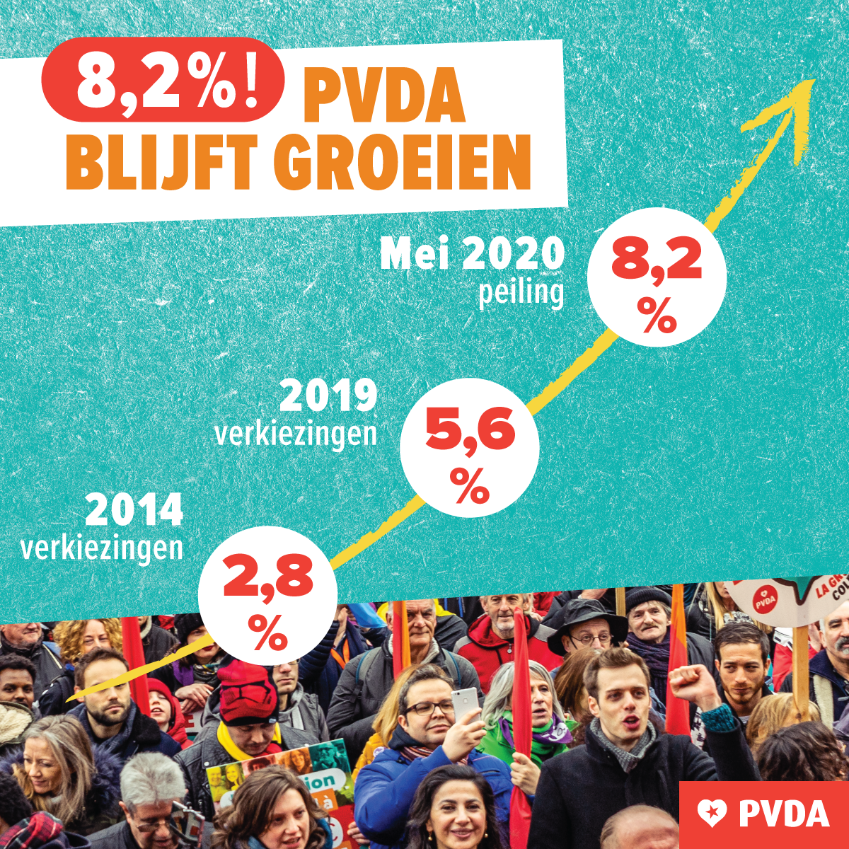 De groeicurve van de PVDA is opmerkelijk : van 2,8% in 2014 naar 5,6% vorig jaar naar 8,2% vandaag. Wie vorig jaar voor onze partij stemde zou dat opnieuw doen, en er komen nog eens de helft nieuwe kiezers bij! In Vlaanderen zouden we van 225.000 kiezers vorig jaar naar 350.000 kiezers vandaag gaan. In het Vlaams Parlement zouden we er 5 extra zetels bijkrijgen (van 4 naar 9), en in het Federaal Parlement zouden we er 4 extra zetels bijkrijgen (vanuit Vlaanderen).