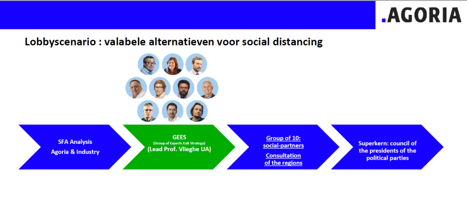 Agoria, de machtige werkgeversfederatie van de metaalindustrie ontwikkelt een "lobbyscenario" naar de groep van deskundigen en de overheid toe om aan te dringen op de heropening van bedrijven waar de regels van sociaal afstand houden (social distancing) niet kunnen worden gerespecteerd (zie onderstaand schema).