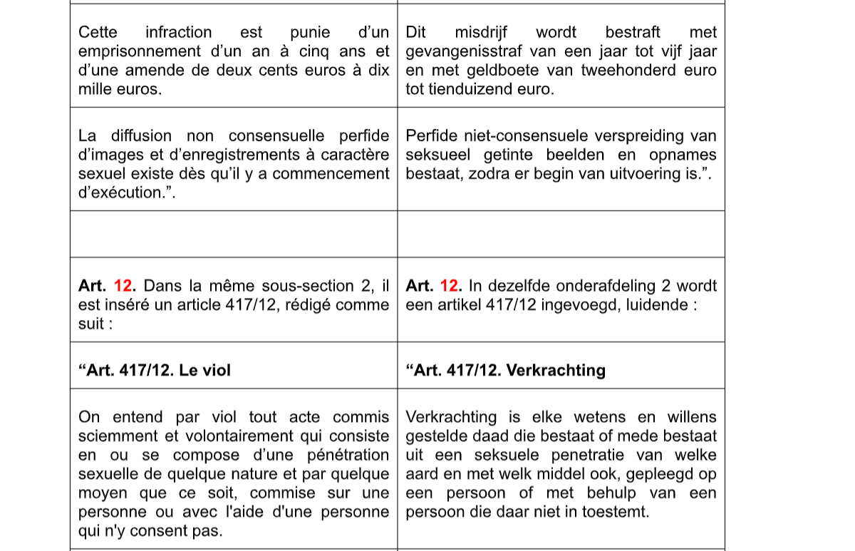 De nieuwe omschrijving van verkrachting die erin staat, luidt als volgt: “elke wetens en willens gestelde daad die bestaat of mede bestaat uit een seksuele penetratie van welke aard en met welk middel ook, gepleegd op een persoon of met behulp van een persoon die daar niet in toestemt.” Deze formulering maakt het nog moeilijker voor het slachtoffer om bewijs te leveren van een verkrachting. Bovenop het feit dat men moet aantonen dat er een penetratie heeft plaatsgevonden, die ook nog eens tegen de wil was, moet er ook nog aangetoond worden dat de dader intentioneel handelde.