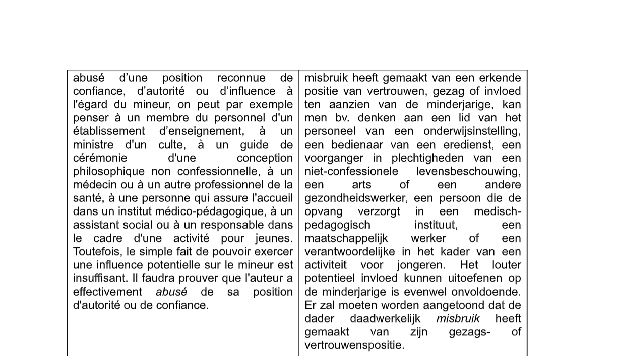 Verder in het ontwerp gaat het over seksueel misbruik van minderjarigen door een persoon in een gezags- of vertrouwensfunctie: “Het louter potentieel invloed kunnen uitoefenen op de minderjarige is evenwel onvoldoende. Er zal moeten worden aangetoond dat de dader daadwerkelijk misbruik heeft gemaakt van zijn gezags- of vertrouwensfunctie.” Hoe kan een minderjarige dit bewijzen? Dit maakt jonge slachtoffers kwetsbaar.