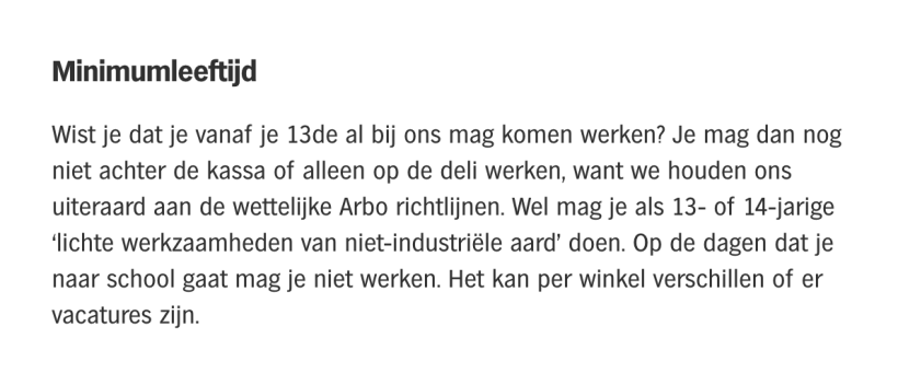 Bij Albert Heijn maken ze er geen geheim van: “Wist je dat je vanaf je 13de al bij ons mag komen werken?” Ze lopen er zelfs mee te koop op hun website. In Albert Heijn-winkels zijn tot 70% minderjarigen aan het werk.