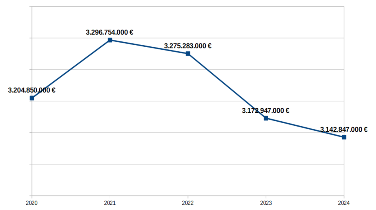 - Wanneer we de hele legislatuur bekijken, blijkt dat na een stijging van de financiering voor de spoorwegen tussen 2020 en 2021, de financiering voor de volgende drie jaar, van 2022 tot 2024, een dalende tendens vertoont. Met een daling van 62 miljoen euro over de gehele zittingsperiode (zie grafiek).