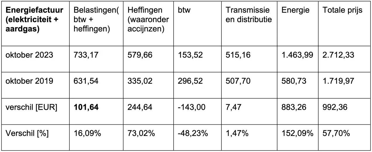 Deze hogere heffingen maken het voordeel van de btw-verlaging (- 48%) volledig ongedaan en zorgen ervoor dat een gemiddeld gezin vandaag 102 euro meer aan energietaksen betaalt dan in 2019.