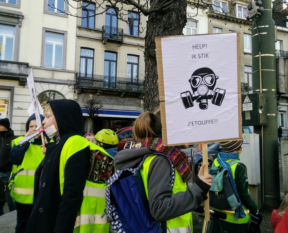 “Help, ik stik”, stond er op vele bordjes die kinderen hadden meegebracht. De oproep van het oudereninitiatief Filter-Café-Filtré om voortaan elke vrijdagochtend aan de schoolpoorten actie te voeren, kreeg veel respons. Vorige week deden 5 scholen mee, deze week al 40, waarvan 22 in Brussel en 18 in divers Vlaamse provincies. Ouders sloten een kwartier lang symbolisch de schoolstraat af. Ze willen dat de overheid in actie komt, maar die staat niet bepaald te springen.