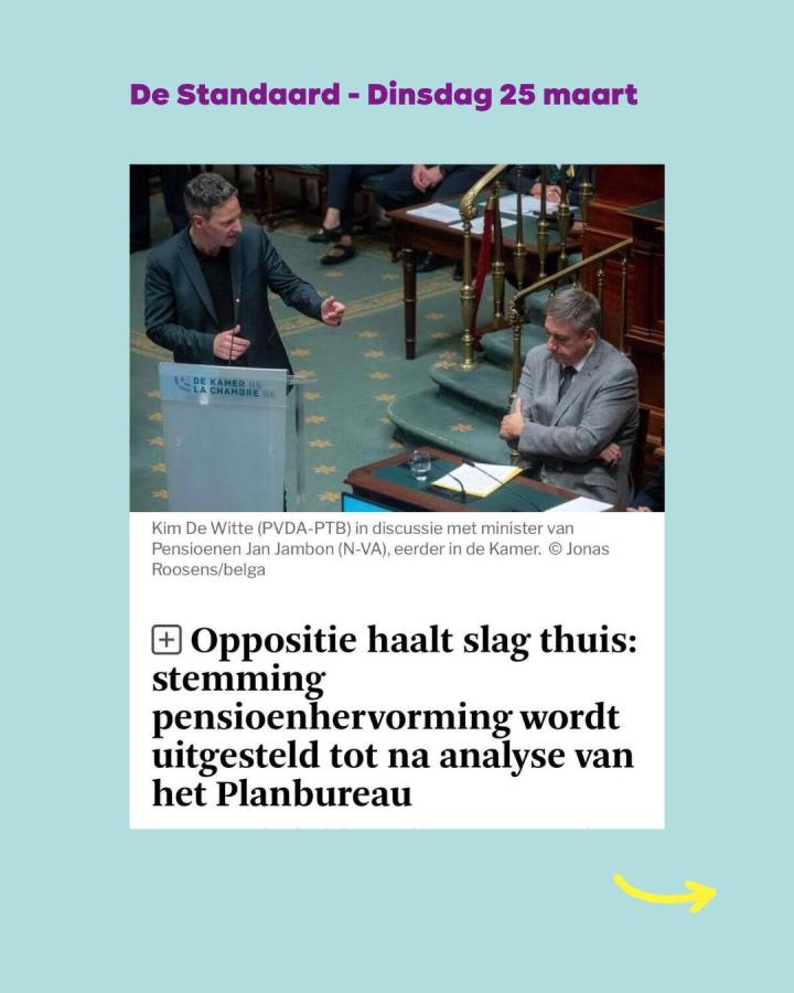 Onder druk van de sociale beweging, de brede publieke opinie, de PVDA en de andere oppositiepartijen wordt de eerste stemming over de pensioenhervorming uitgesteld. De regering probeerde de pensioenhervorming in sneltempo door het parlement te jagen, maar is nu verplicht om gas terug te nemen. Minister Jambon en de meerderheidspartijen kondigden dinsdag aan dat ze dan toch de impactstudie van het Planbureau afwachten. Concreet betekent dit een eerste uitstel van minstens twee weken.