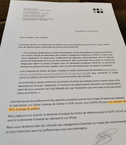 Verschillende artsen van de groepspraktijken van Geneeskunde voor het Volk, waaronder Sofie Merckx, werden door laboratoria gecontacteerd met het voorstel om ook patiënten die niet aan de vastgelegde criteria beantwoorden te testen. “Tests die niet aan de gevalsdefinitie beantwoorden, worden momenteel niet terugbetaald door het RIZIV en zijn volledig op kosten van de patiënten. Uit onze rondvraag blijkt dat labo’s hier tot 75 euro voor vragen, dat is meer dan het dubbele van de kostprijs”, aldus Sofie Merckx. “Heel wat mensen zijn vandaag erg bezorgd dat ze eventueel besmet zouden zijn en sommige spelers lijken nu van die ongerustheid te profiteren om winst te maken. Dat is onaanvaardbaar”.