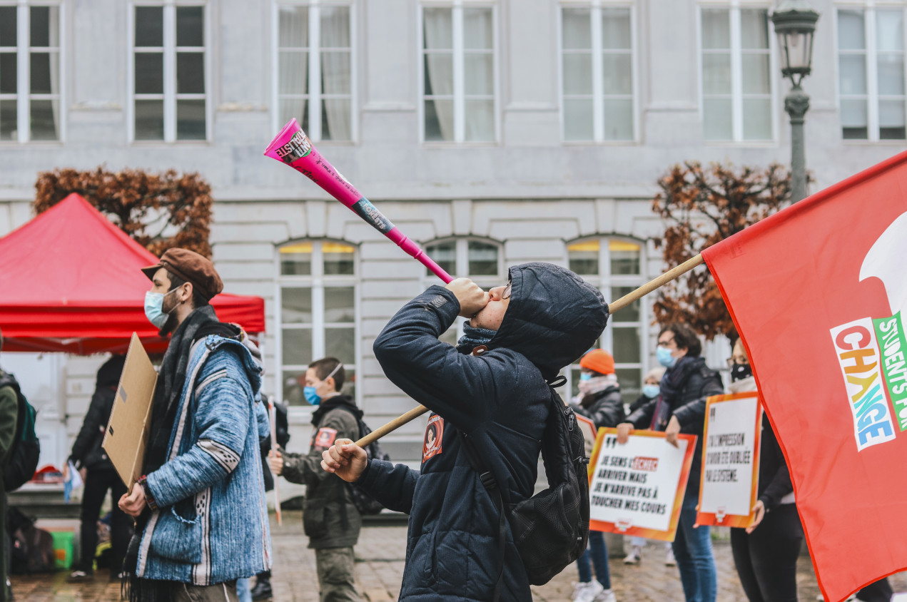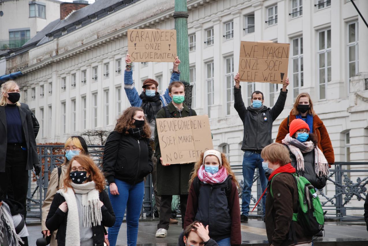 Een honderdtal studenten verzamelde voor de actie op het Martelaarsplein in Brussel, voor de gebouwen van de Vlaamse regering. Ook Vlaams PVDA-fractieleider Jos D’Haese was aanwezig. De PVDA diende een resolutie in waarin ze vraagt dat corona als overmachtsituatie kan worden ingeroepen zodat mensen hun studiepunten niet verliezen. Dat systeem was vorig academiejaar ook al mogelijk.