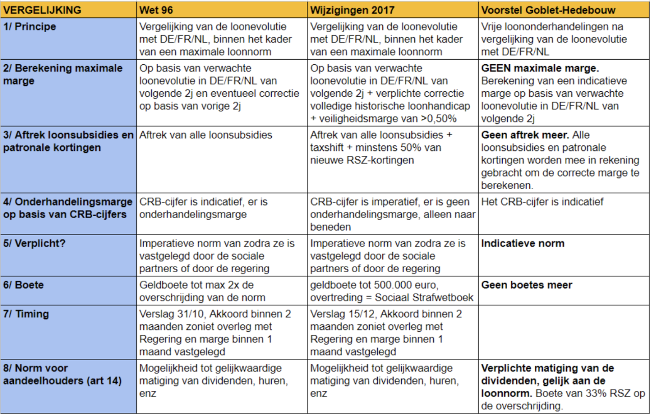 De Wet96 en de Wetswijziging van 2017 vertrekken vanuit een loonvergelijking met de buurlanden. Die grijpen ze aan om een maximale loonnorm op te leggen. Het wetsvoorstel Goblet-Hedebouw vertrekt vanuit het principe van vrije loononderhandelingen. Ze vergelijkt alleen met de buurlanden om een indicatie te hebben.