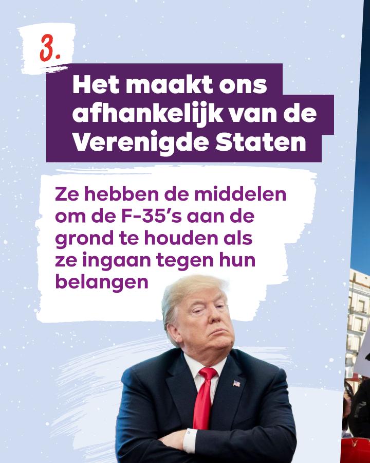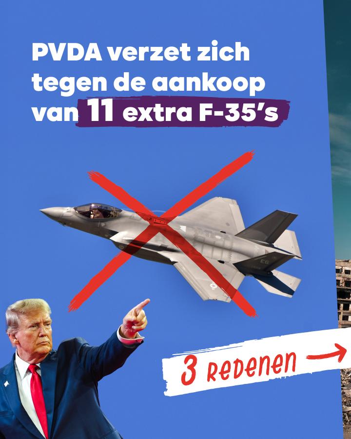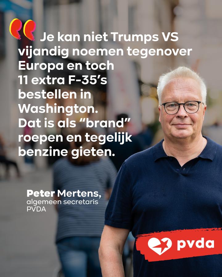 “Je kan niet tegelijk brand roepen en benzine gieten: als je zegt dat Trumps VS vijandig staat tegenover Europa, bestel je niet nog eens 11 extra F-35’s in Washington, en lever je onze defensie niet uit aan het Pentagon”, zegt Peter Mertens, algemeen secretaris van de PVDA. “Morgen in het parlement dienen wij een resolutie in om die aankoop te annuleren.”