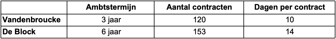 2. Precieze berekening: Minister Vandenbroucke sloot 120 contracten. Het eerste contract ging in op 1 november 2020 en het laatste op 1 april 2024. 1186 dagen / 120 contracten = 9,88 dagen / contract.