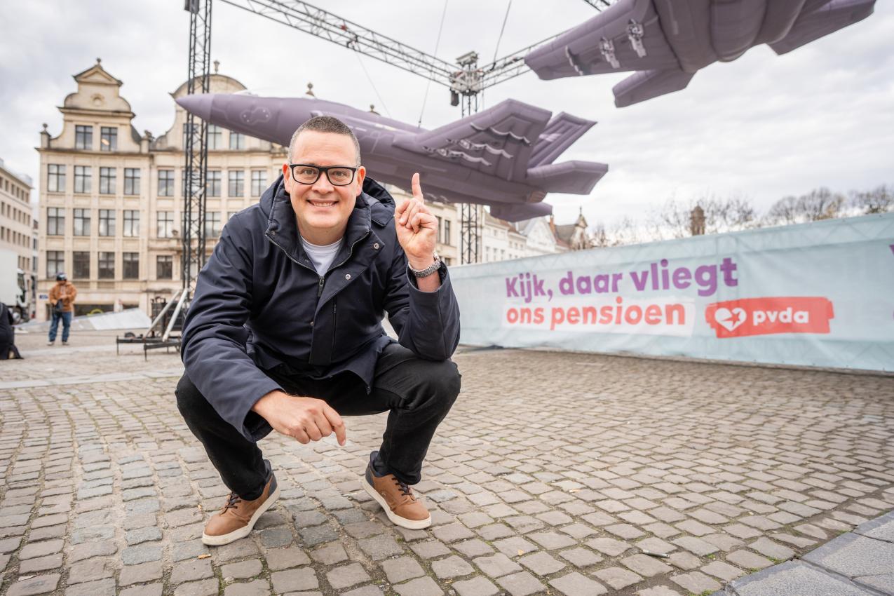 “De totale factuur van deze 11 gevechtsvliegtuigen loopt op tot 6 miljard als je onderhoud, training en updates meetelt. En dat geld wordt onder andere opgehaald door mensen te verplichten tot 67 jaar te werken, afgedwongen met een boetesysteem als de pensioenmalus. De regering kiest ervoor om geld uit te geven aan oorlog, terwijl ze de pensioenen en de sociale zekerheid afbreekt en langdurig zieken in het vizier neemt”, stelt Raoul Hedebouw.