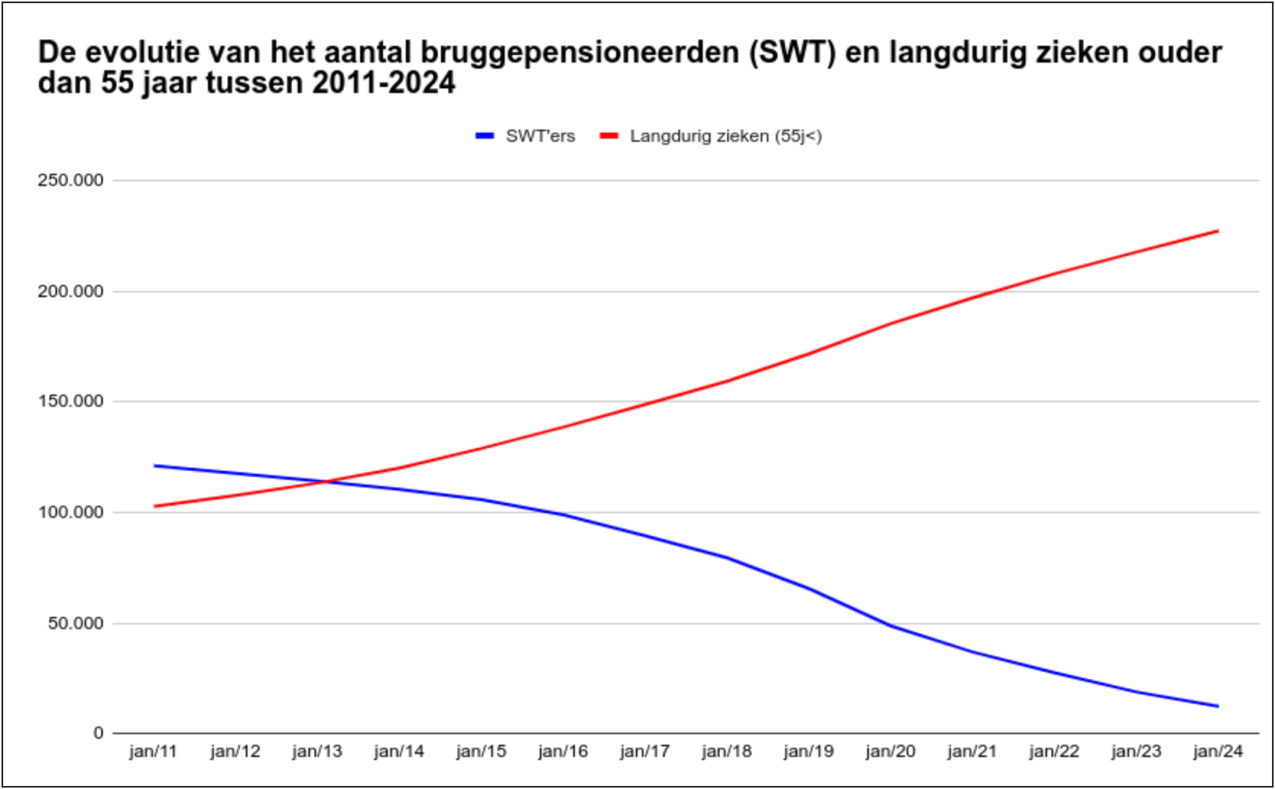 Tussen 2011 en 2024 daalde het aantal bruggepensioneerden met 108.648 eenheden. Over diezelfde periode kwamen er 124.582 oudere langdurige zieken bij. Voor elke bruggepensioneerde die sinds 2011 is verdwenen, kwam er dus minstens één oudere langdurig zieke bij.