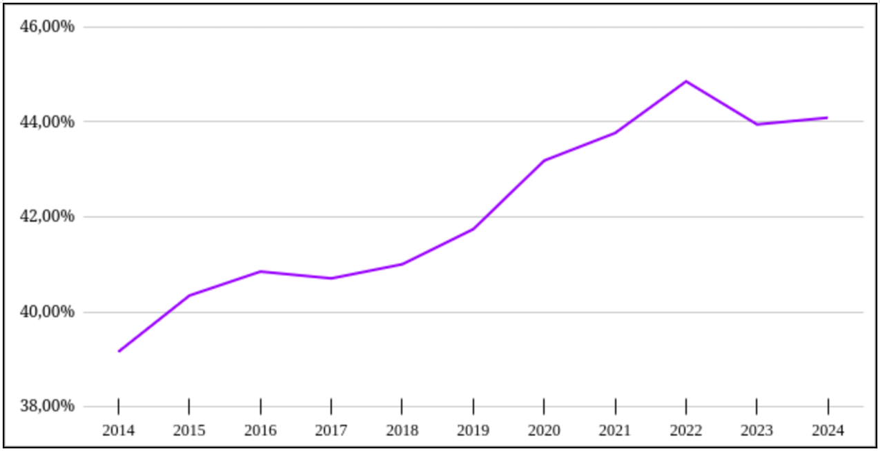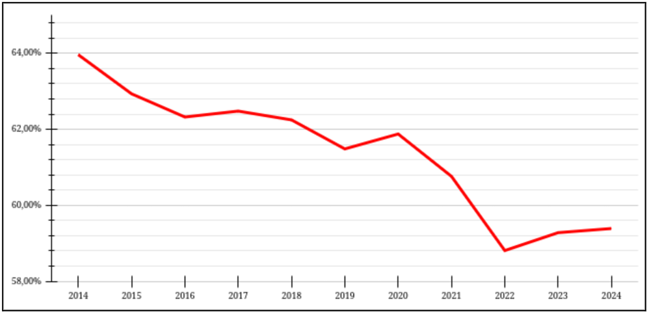 Tussen 2014 en 2024 daalde het aandeel van de lonen in de toegevoegde waarde van niet-financiële bedrijven van 63,96% naar 59,39%, een daling van 4,57 procentpunten. In dezelfde periode is het aandeel van de winst in dezelfde verhouding gestegen. Dit weerspiegelt een duidelijke verschuiving in de verdeling van toegevoegde waarde van beloning van arbeid naar kapitaal.