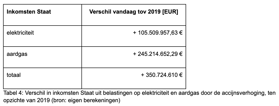 De accijnsverhoging deed de belastinginkomsten van de staat op elektriciteit en aardgas stijgen met 351 miljoen euro. In 2019 bedroegen die inkomsten nog 2,72 miljard euro, vandaag zijn die gestegen tot 3,08 miljard euro (tabellen 3 en 4).