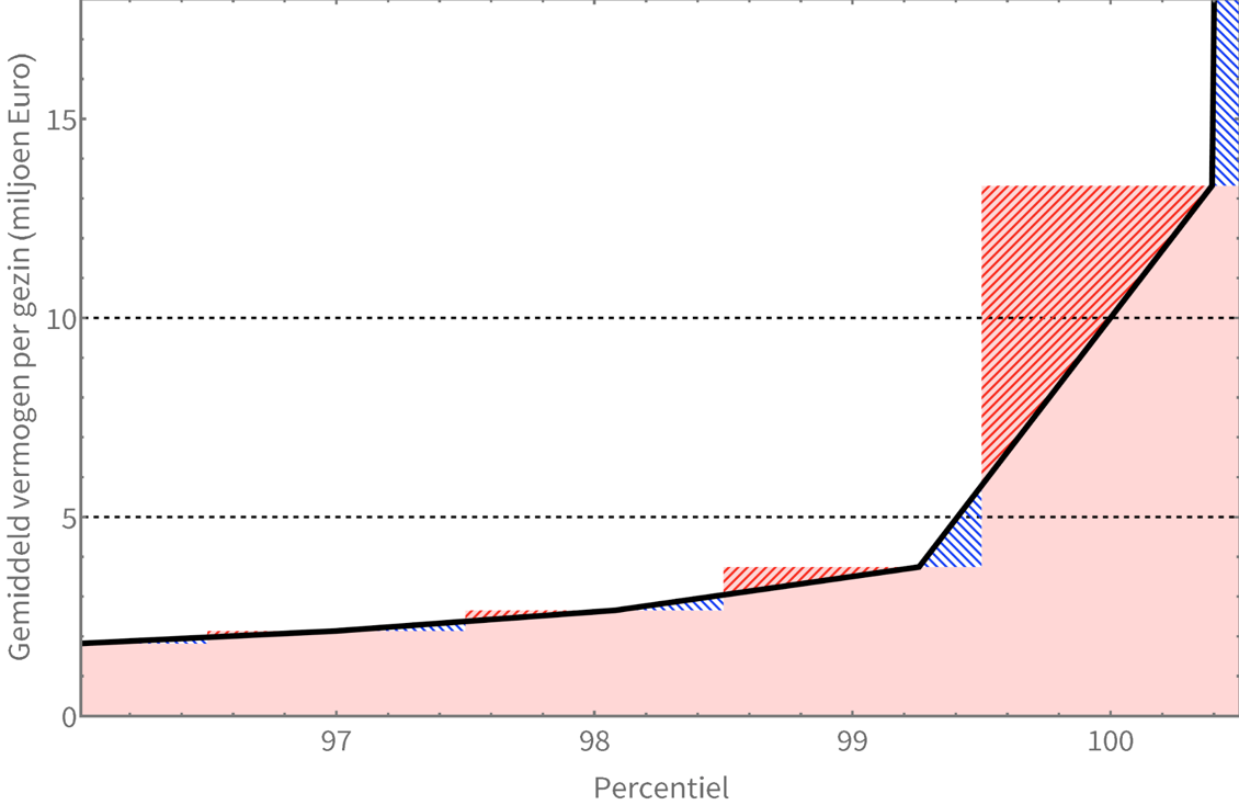 In bovenstaande figuur tonen de rode balken voor de vier hoogste percentielen de verdeling van het vermogen per gezin. De horizontale zwarte stippellijnen geven de grenswaarden voor 5 en 10 miljoen euro aan. De zwarte lineaire curve geeft de gebruikte vermogensverdeling aan. De rood en blauw gearceerde driehoeken geven aan welke delen van de originele verdeling door de lineaire benadering herschat worden. Binnen ieder percentiel compenseren beide driehoeken elkaar zodat het totale vermogen van het percentiel niet aangepast wordt.