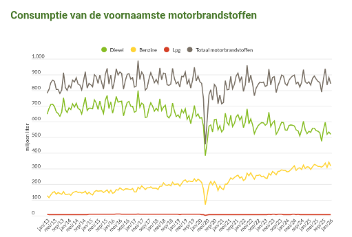 We zien een stijgende trend voor de consumptie van benzine en een dalende trend voor diesel. We zien dat het totale brandstofverbruik schommelt, maar relatief stabiel blijft de laatste jaren. Voor de inschatting van de meerinkomsten uit btw gebruiken we het gemiddelde gebruik van 2025.